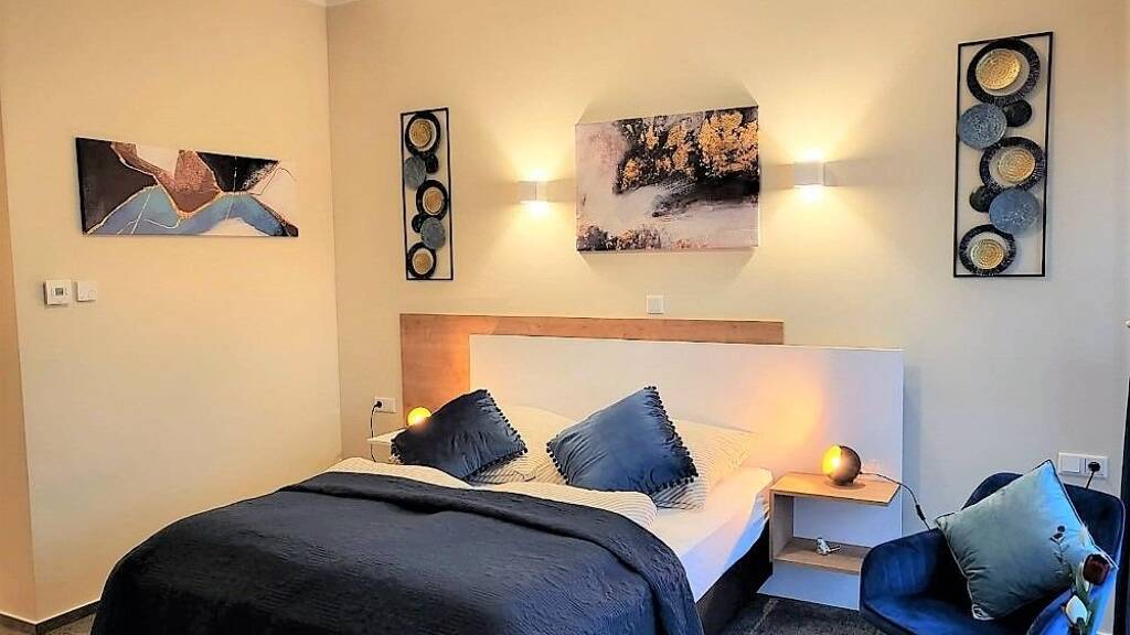 Der Schlafbereich ist mit einem 160cm breiten Doppelbett und einem zweiten Fernseher. Ein Großer Kleiderschrank bietet Ihnen großzügigen Stauraum.