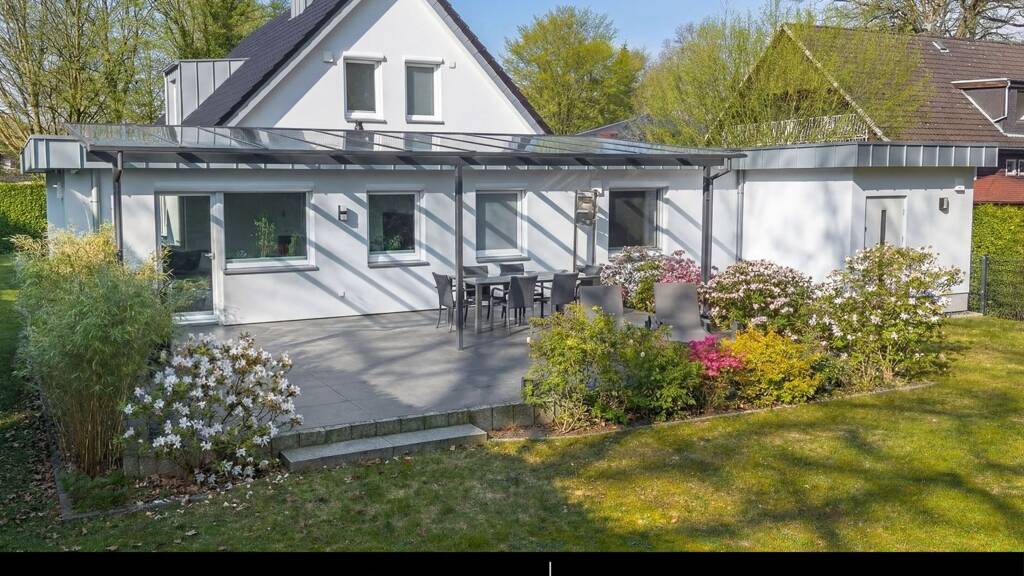 Der Außenbereich überzeugt durch einen gepflegten, kaum einsehbaren Garten mit viel Grünfläche und zwei attraktiven Terrassen, darunter eine hochwertig überdachte Terrasse im rückwärtigen Garten. Eine beheizte Garage, ein Carport für zwei Fahrzeuge sowie weitere Stellplätze in der Einfahrt stehen zur Verfügung.