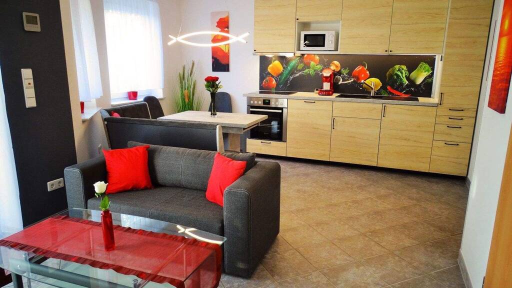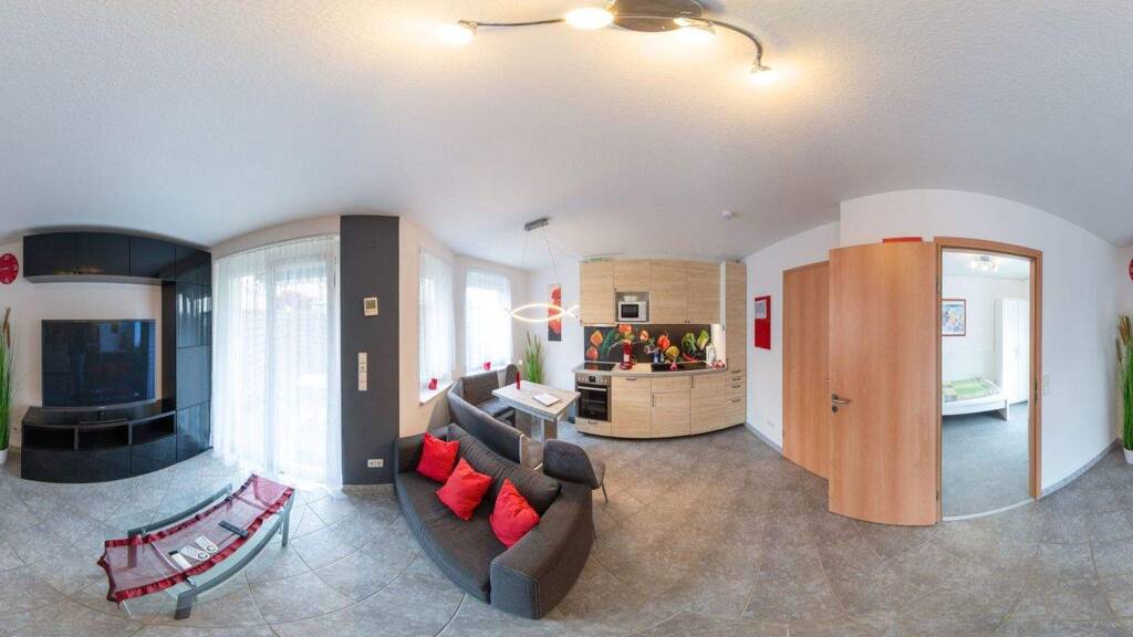 Das große Wohnzimmerr (ca. 21qm) hat Fußbodenheizung, einen gemütlichen Essbereich mit Eckbank und eine eigene komplett ausgestattet und löffelfertig Küchenzeile(mit Ceranfeld, Backofen, Geschirrspüler, Microwelle, Kühlschrank, Pad Kaffeemaschine, Wasserkocher, Toaster, Eierkocher, Spülbecken) Der Wohnbereich hat Sofa, Tisch, einen großen Schrank und einen extra großen TV-Flachbildschirm(Kabel). Das Schlafzimmer (ca. 9qm) hat 2x Einzelbett, Garderobe, Wäscheschrank und einem kleinen Schreibtisch. Ingesamt haben Sie hier 30 qm.