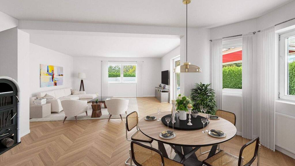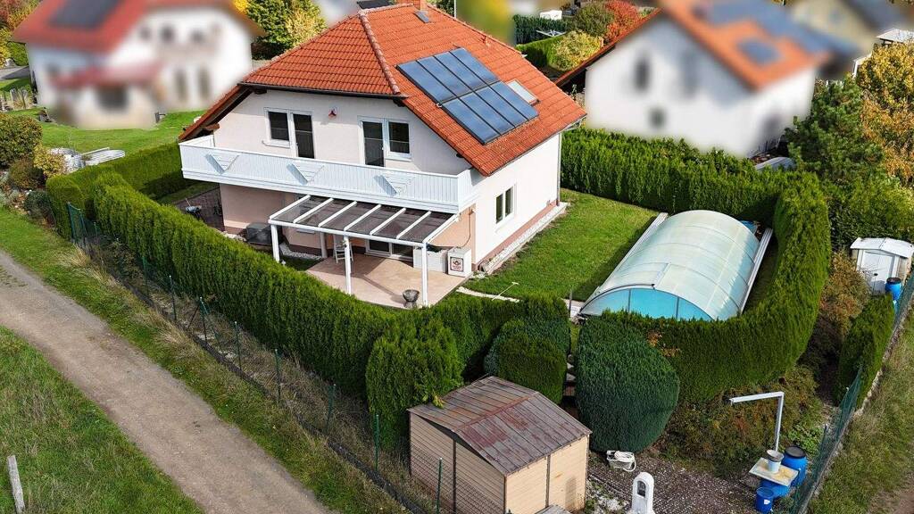 Vom großzügigen Wohn- und Essbereich mit Kaminofen gelangen Sie direkt auf die sonnige Terrasse, die mit einem festen Sonnenschutz an Dach und Seiten ausgestattet ist - perfekt für entspannte Stunden im Freien. Hier eröffnet sich der Blick auf den beheizten Pool und den weitläufigen, liebevoll angelegten Garten, der sowohl für Spiel und Spaß der Kinder als auch für erholsame Stunden im Grünen ideal ist. Die Kombination aus Pool, Terrasse und Garten schafft ein einladendes und familienfreundliches Außenambiente.