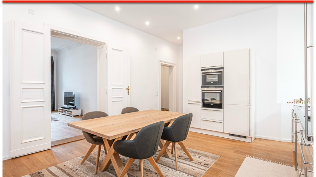 Das Wohnzimmer präsentiert sich stilmäßig mit einer prächtigen Stuckumrahmung an der Decke und drei großzügigen Fenstern mit Balkonblick. Es ist durch eine Flügeltür mit der eleganten, offen gestalteten Küche verbunden, in deren Raummitte sich ein heller Essbereich befindet. Der Kochbereich mit Fenster bietet eine weiße Hochglanzküche mit schwarzer Arbeitsplatte und Siemens Einbaugeräten sowie moderne Deckenspots. Die Küche geht offen in beide Flure über. Der vordere Flur bietet Zugang zu einem Badezimmer mit Dusche, Waschbecken, Handtuchtrockner, WC und Fenster sowie zu einem großen Schlafzimmer mit Schreibtischbereich. Dieses Schlafzimmer mit zwei Fenstern bietet Zugang auf einen überdachten Balkon mit Häuserblick.