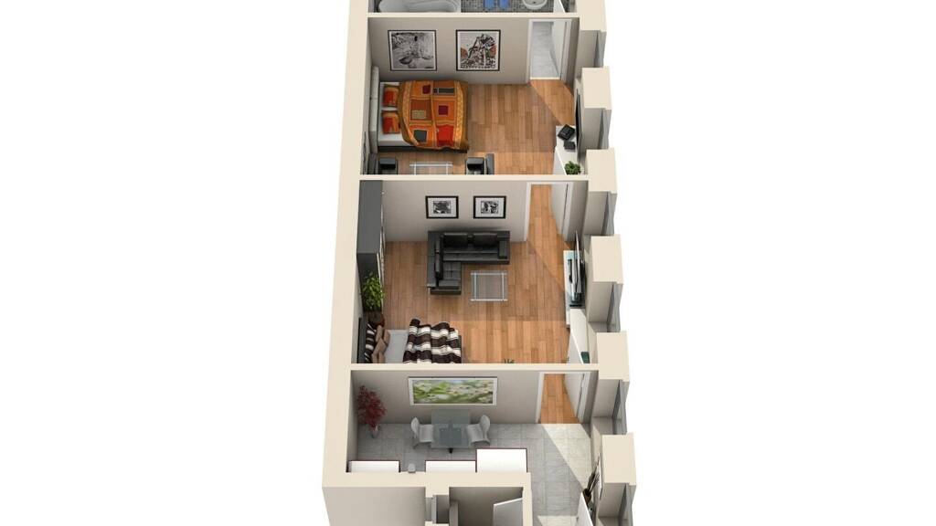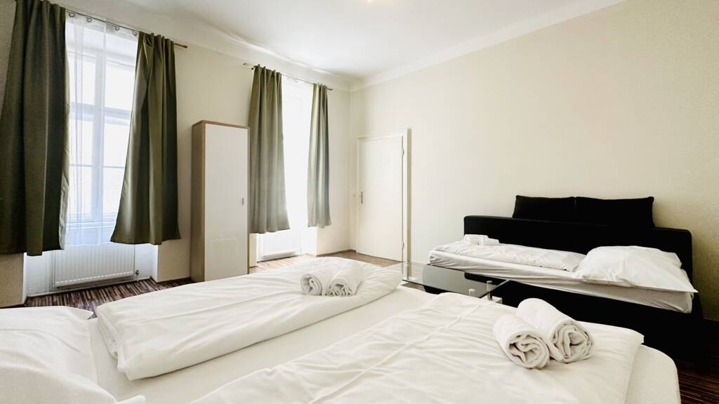 Das geräumige, lichtdurchflutete Wohnzimmer ist mit einem Esstisch, einem Kleiderschrank, einem TV, sowie einem Bett ausgestattet. Im angrenzenden, ebenfalls sehr weitläufigen, hellen Schlafzimmer, befinden sich aktuell eine Schlafcouch, sowie ein weiteres Doppelbett. Aktuell bietet die Wohnung Schlafgelegenheiten für bis zu 6 Personen.