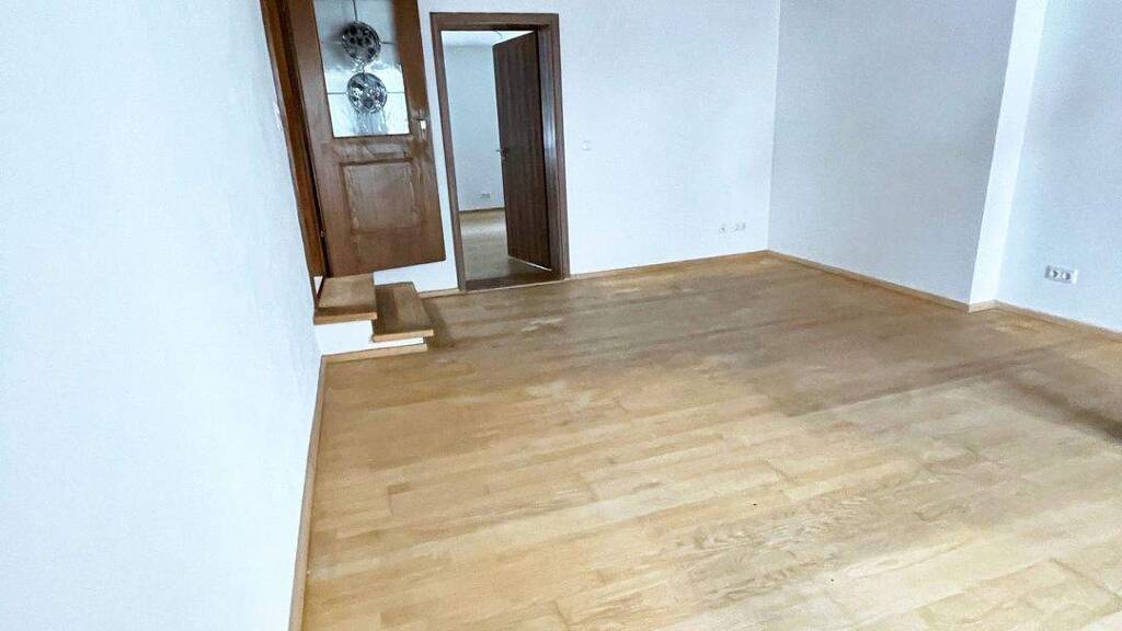Vom Flur im Treppenhaus führen ein paar Treppenstufen geradeaus ins Wohnzimmer. Links vom Wohnzimmer befindet sich der Zugang zum Schlafzimmer. Das Wohnzimmer geht nahezu nahtlos in den Wintergarten über, der durch einige Stufen etwas abgetrennt, aber dennoch offen und lichtdurchflutet wirkt. Der Wintergarten bringt Helligkeit in die Wohnung und besticht vor allem durch einen gemütlichen Holzofen. Vom Wintergarten aus gelangt man ebenfalls zur großzügigen Sonnenterrasse, auf der man das Leben und den Alltag entspannt genießen kann, während man sonnige Stunden verbringt.