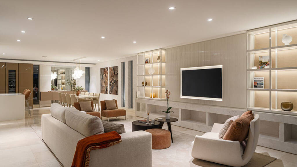 This is a house for people who value flow. The lower level handles leisure properly - entertainment room with bar, cinema area with projector, gym and sauna - so the living floors remain clean and composed.