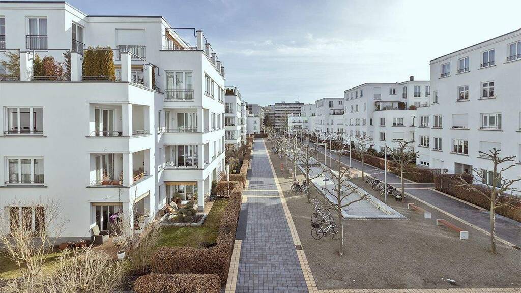 Die Wohnanlage umfasst acht Häuser entlang einer autofreien Platanenallee und verfügt über ein rund 70m langes, beleuchtetes Brunnenbecken.