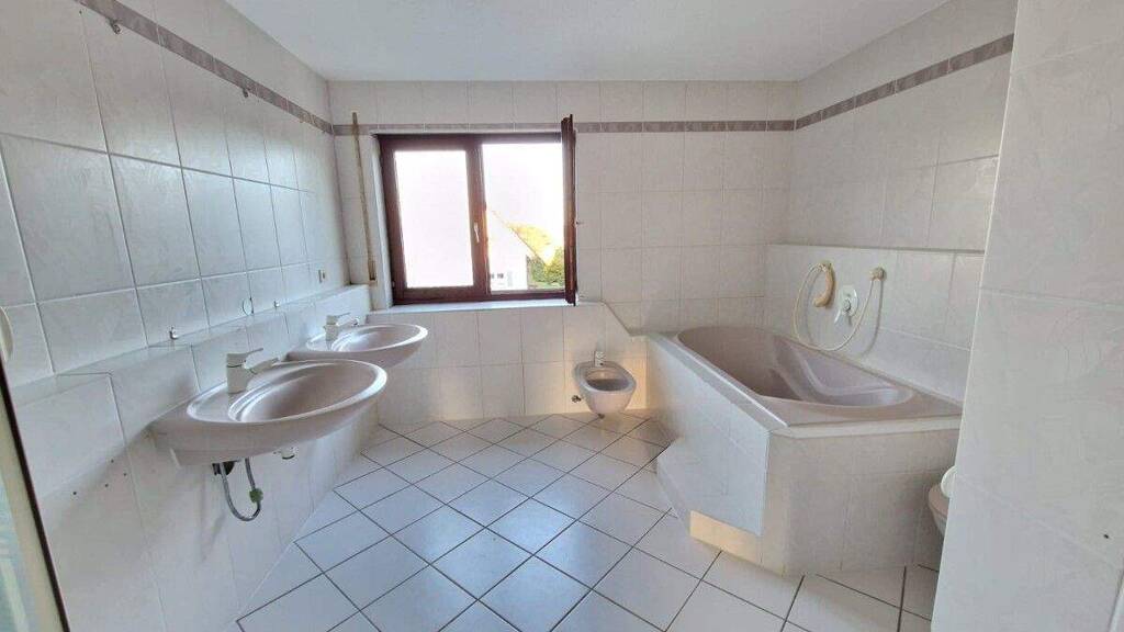 groĂźes Bad mit Wanne, Dusche, WC, Bidet, 2 Waschbecken und Fenster.