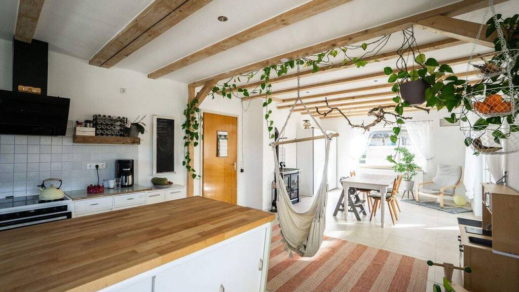Auf dieser Ebene befindet sich zudem ein Zimmer, das als Wohnzimmer oder Schlafzimmer genutzt werden kann. Derzeit dient es als Wohnzimmer. Das Highlight des Erdgeschosses ist die helle, offene Küche mit angrenzendem Essbereich. Bei der Renovierung wurde die ursprüngliche Mittelwand entfernt, wodurch ein großzügiges Raumgefühl entsteht. Die funktionale Küche wurde liebevoll an den Raum angepasst. Ein Holz-Herdofen im Essbereich unterstreicht den charmanten Landhausstil. Sichtbalken im Wohnbereich schaffen zusätzlich eine warme Atmosphäre. In Kombination mit dem überdachten Balkon, der sich über die gesamte Hauslänge von knapp 10 Metern erstreckt, wird dieser Koch- und Essbereich zu jeder Jahreszeit zum besonderen Highlight. Gemeinsames Kochen mit Freunden, Geburtstagspartys oder Familienfeste jeglicher Art können hier stattfinden.