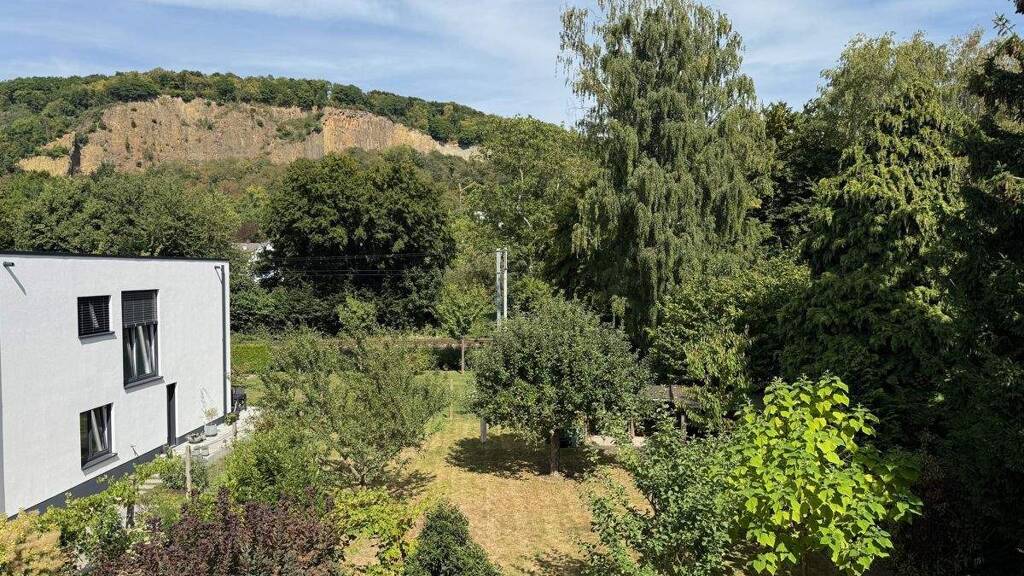 Man erhält Blick ins Grüne und zum Oberkasseler Steinbruch. Ein großer überdachter Balkon, teilweise beschattet durch eine Markise befindet sich auf der gesamten Breite des Hauses.