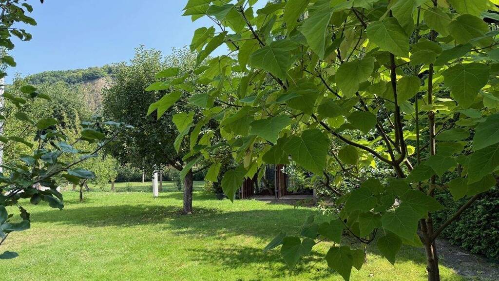 sehr schöner und großzügig angelegte Garten mit Obstbäumen und Holzunterstand.