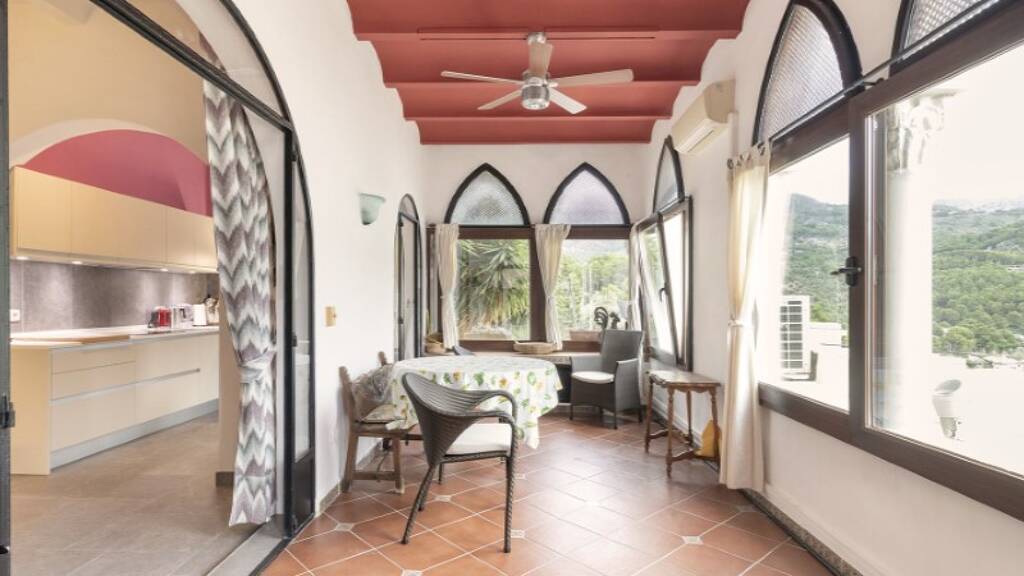 Der Innenbereich der Wohnung umfasst derzeit drei Schlafzimmer, mit der Option, ein viertes Zimmer hinzuzufügen, um den Raum optimal zu nutzen. Zwei Badezimmer, eine moderne Küche sowie charmante Details wie zwei Kamine, originale Holzbalken und gut erhaltene Mosaikböden verleihen der Wohnung eine warme und zugleich stilvolle Atmosphäre. Eine Klimaanlage sorgt für zusätzlichen Komfort.