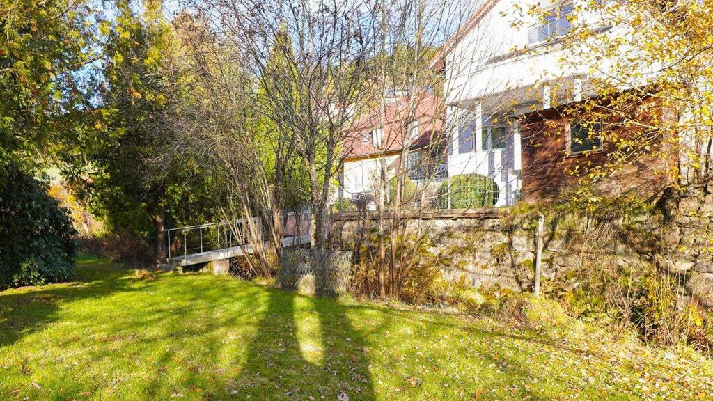 Ein echtes Highlight ist der großzügige, naturnahe Garten. Ein Bach durchfließt das Grundstück und verleiht ihm eine außergewöhnlich idyllische Atmosphäre. Über eine kleine Brücke lässt sich der Garten auf charmante Weise erreichen. Ein Ort, der für Kinder wie Erwachsene gleichermaßen Erlebnis- und Rückzugsraum ist. Ein Ort für barfuß spielende Kinder, lange Sommerabende und entspannte Zeit im Grünen. Die große Terrasse, die direkt vom Wohnzimmer im Obergeschoss sowie von einem Schlafzimmer aus begehbar ist, bietet einen herrlichen Blick in den Garten und lädt zum gemeinsamen Essen, Entspannen oder Feiern ein. Zusätzlich steht im Dachgeschoss ein Balkon zur Verfügung.