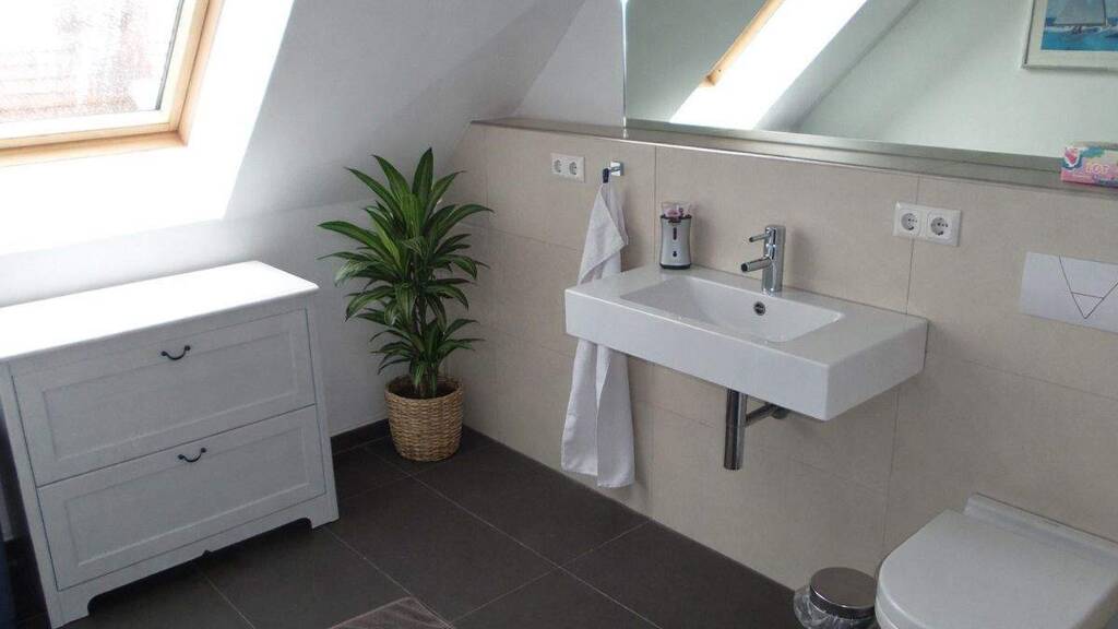 + Modernes Tageslichtbad in freundlicher Sandsteinoptik mit Badewanne