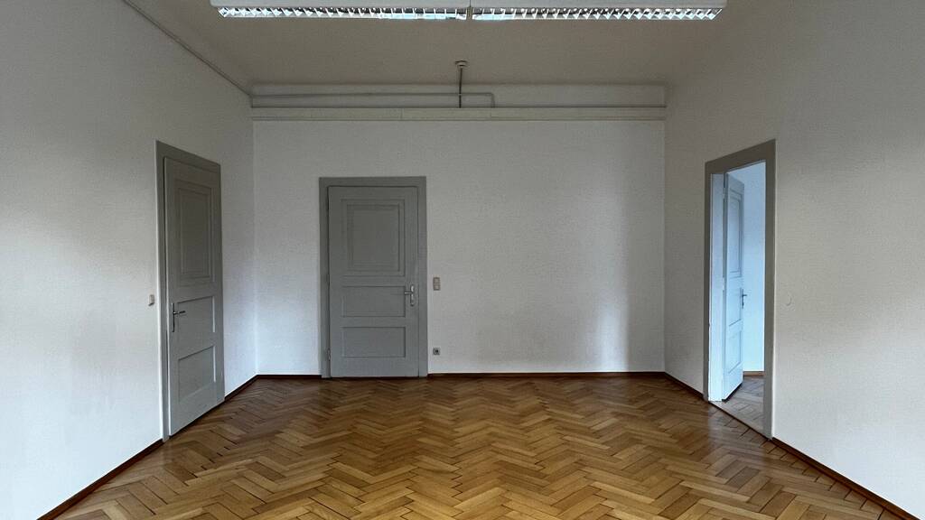 Die Büroräume unterteilten Flächen bestechen durch ihren klassischen Altbaustil. Merkmale wie das elegante Fischgrätparkett, große Altbaufenster und die großzügige Raumhöhe tragen zu einem charmanten und repräsentativen Arbeitsumfeld bei.
