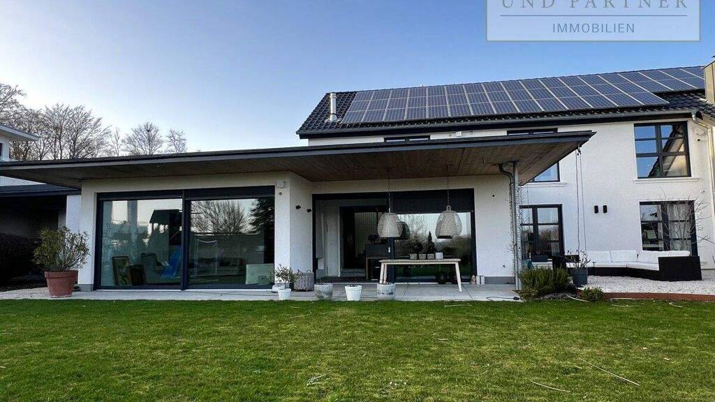 Mit über 370 m² Wohnfläche präsentiert sich dieses außergewöhnliche Zuhause als perfekte Verbindung aus Großzügigkeit, moderner Architektur und technischer Raffinesse. Das ursprüngliche Gebäude wurde vollständig zurückgebaut, erweitert und mit höchstem Qualitätsanspruch neu gestaltet. Energetisch auf Neubauniveau gebracht, vereint die Immobilie heute Stil, Komfort und Nachhaltigkeit - in begehrter Lage "Am Rödgen". Als eigenständige Einheit innerhalb eines Doppelhauses bietet das Haus rechtliche Unabhängigkeit und zugleich ein beeindruckendes Grundstücksgefühl: Der Grundstücks-Anteil von ca. 1.879 m² umfasst einen weitläufigen Garten, sonnige Terrassenflächen, ein Doppelcarport sowie zusätzliche Stellplätze. Hier genießen Familien Ruhe und Privatsphäre. Im Erdgeschoss (ca. 244 m²) empfängt ein großzügiger Eingangsbereich mit klarer architektonischer Linie. Das Herzstück bildet der offene Küchen- und Wohnbereich mit dreiseitig einsehbarem Gaskamin - ein stilvoller Mittelpunkt für gemeinsame Stunden. Die hochwertige Küche geht fließend in den Essbereich über und schafft eine kommunikative Wohnatmosphäre. Der separierte Elternbereich mit Ankleide und elegantem Bad en suite bietet einen privaten Rückzugsort. Ergänzt wird diese Ebene durch ein Arbeitszimmer, Gäste-WC sowie einen Hauswirtschaftsraum, der auch durch einen separaten Eingang von draußen erreichbar ist. Im Obergeschoss (ca. 129 m²) stehen zwei großzügige Kinderzimmer mit Spielbereich zur Verfügung. Ein vorbereitetes Badezimmer ermöglicht die individuelle Gestaltung eines großzügigen Kinderbades oder einer Sauna. Zusätzlich gibt es ein Gästezimmer mit eigenem Duschbad sowie einen weiteren Hauswirtschaftsraum. Das Haus ist unterkellert. Alles in allem ein Haus für Menschen, die Großzügigkeit, Qualität und ein besonderes Wohngefühl suchen.