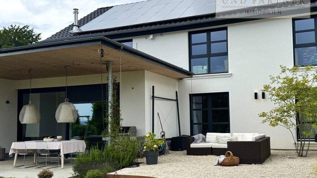 dreifachverglaste Leichtmetall-Kunststofffenster mit durchgehender Sprossenteilung, und elektrischen Zip-Screens zur Beschattung auf Süd- und Westseite, geöltes französisches Fischgrätparkett in Eiche, kombiniert mit Castle Stones Loft-Bodenplatten Eichedielen im Obergeschoss Vaillant-Gas-Brennwerttherme Fußbodenheizung zusätzlicher Festbrennstoffkessel für flexible Nutzung - auch bei steigenden Energiepreisen. kontrollierte Wohnraumlüftung mit Feuchtigkeitssteuerung Küche: Maßanfertigung von Leicht, mit Bora-Induktionsfeldern inkl. Teppanyaki-Grill, Abluftsystem und V-Zug-Einbaugeräten (Combi-Steamer, Backofen, Weinkühler, Geschirrspüler). Smart Home: voll integriertes Loxone-System für Licht, Heizung, Alarm, Gartenbewässerung und Außenbeleuchtung, jeder Punkt einzeln und per App steuerbar, Zisterne zur Regenwassernutzung Gartenhaus Rasenroboter Sprenkler-Anlage von Hunter, steuerbar über SmartHome Raffstores Steckdosen über jedem Fenster