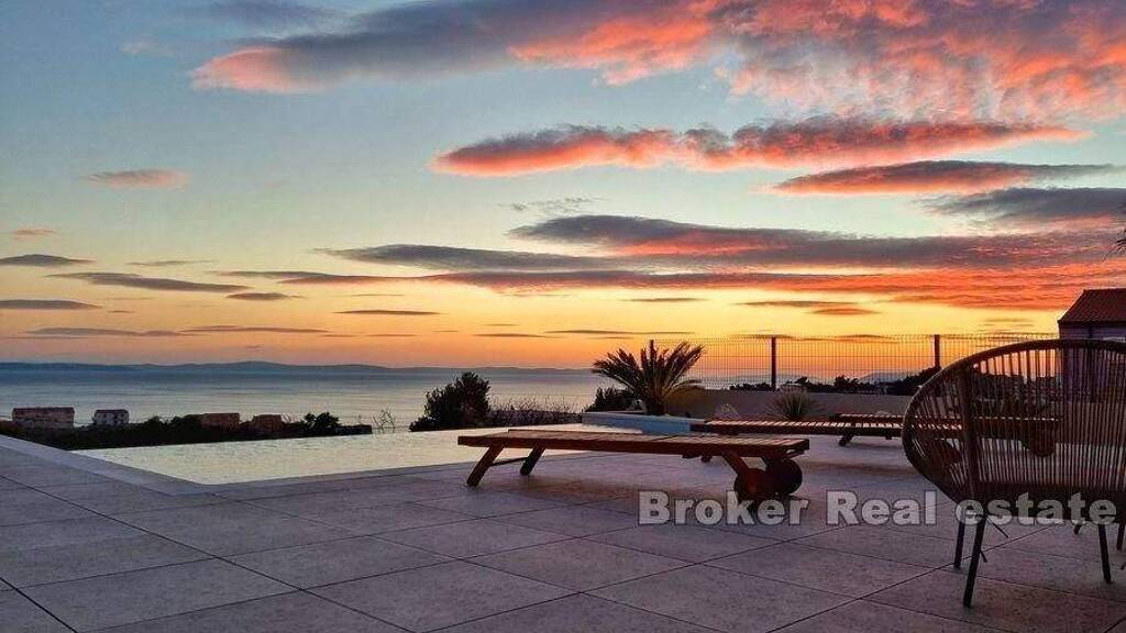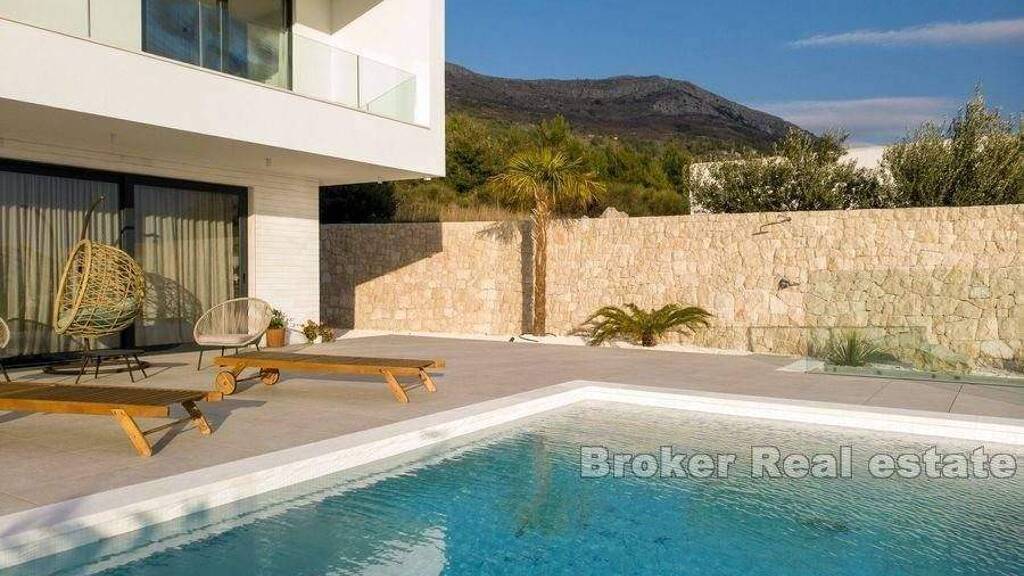 Es besteht aus drei modern ausgestatteten Etagen und wurde 2021 erbaut. Im ersten Stock befindet sich ein Eingang mit Einbauschränken, ein Badezimmer, ein geräumiges Wohnzimmer, das durch Glasschiebewände mit dem Außenbereich am Pool verbunden ist, eine Küche und ein Esszimmer. Auf der zweiten Etage befinden sich zwei Schlafzimmer von 20 m2 mit offenem Schrankkonzept und großen Fenstern, jedes mit eigenem Bad und einem gemeinsamen großen Balkon mit Blick auf das Meer, von dem aus man eine atemberaubende Aussicht hat. Auf der dritten Etage befindet sich ein Hauptschlafzimmer mit eigenem begehbarem Kleiderschrank und einem durch Glas mit sich selbst verbundenen Badezimmer, das so gestaltet ist, dass Sie nach einem anstrengenden Tag den Sonnenuntergang von Ihrem eigenen funkelnden Bad aus beobachten können.