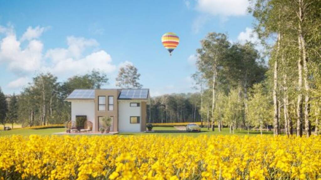 Das Bien-Zenker-Haus außen fertig mit Haustür und Fenstern sowie innen mit Treppe
