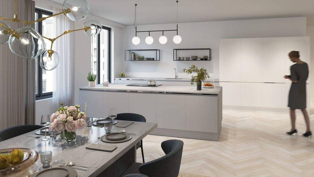 Sie erreichen Ihr Zuhause über das Treppenhaus oder einen Aufzug - direkt in Ihre Wohneinheit! Jede Wohnung begeistert durch ihren großzügigen und offenen Stil und hellen Räumen. Der weitläufige Wohn- Essbereich hat eine Fläche von fast 150 m². Das Herzstück ist die voll ausgestattete Einbauküche die sich harmonisch in den Raum fügt. Deren Pastelltöne geben die Farbrichtung jeder Wohnung vor. Begeistern wird sie ebenso die großflächige Loggia, die Sie zu nahezu jeder Jahreszeit nutzen können und durch freizügige Verglasung dem Wohnraum integriert scheint. Ins Schlafzimmer kommen Sie über die Ankleide das in nördlicher Ausrichtung geplant wurde. Der Blick aus dem Fenster führt im begrünten Innenhof. Das Masterbad ist mit ca. 16 m² Ihr eigener kleiner SPA Bereich mit freistehender Wanne, hochwertigen Armaturen, Badezimmerunterschrank und Regendusche. Ein weiteres Badezimmer, mit Hauswirtschaftsanschlüssen, finden Sie im vorderen Flügel der Wohnung.