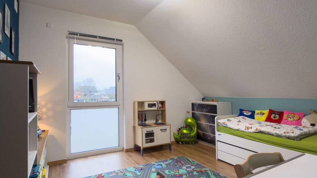 Im Erdgeschoss befinden sich neben dem Wohnbereich ein Gästezimmer bzw. Büro, ein Duschbad sowie der Hauswirtschaftsraum. Das Obergeschoss bietet ein geräumiges Schlafzimmer, drei Kinderzimmer sowie ein modernes Vollbad mit Dusche und Badewanne. Alle Räume sind hell, freundlich und gut proportioniert.