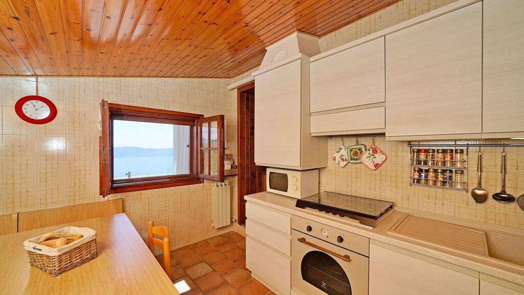 Die Villa zeichnet sich durch eine harmonische und funktionale Architektur aus, mit gut aufgeteilten Räumen und einer einladenden Atmosphäre. Das Wohnzimmer mit Kamin öffnet sich zu einer großzügigen, überdachten Veranda – dem wahren Herzen des Hauses – die einen unvergleichlichen Panoramablick auf den See bietet. Die Küche ist separat und mit einer praktischen Speisekammer ausgestattet, ideal für eine effiziente Raumnutzung. Der Schlafbereich umfasst drei Schlafzimmer und zwei Badezimmer, die höchsten Komfort bieten. Alle Räume sind hell und luftig dank großer Fensterflächen und günstiger Ausrichtung.