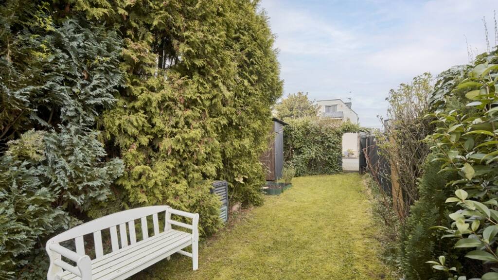Im Erdgeschoss folgt hinter dem einladenden Eingangsbereich auf der rechten Seite das offen gestaltete Esszimmer. Weiter links gelangt man in das praktisch geschnittene Wohnzimmer. Geradeaus befindet sich die moderne, offene Küche sowie das modernisierte Masterbad inklusive Badewanne und Waschmaschinenanschluss. Das Arbeits- oder Gästezimmer komplettiert diese Etage und verfügt über einen separaten Ein- und Ausgang Richtung Garten. Der schöne Garten der Immobilie wird über eine Gemeinschaftsfläche erreicht, dieser verfügt über ein gemütliches Gartenhaus. Hier können die persönlichen Wünsche der Gartengestaltung umgesetzt werden.
