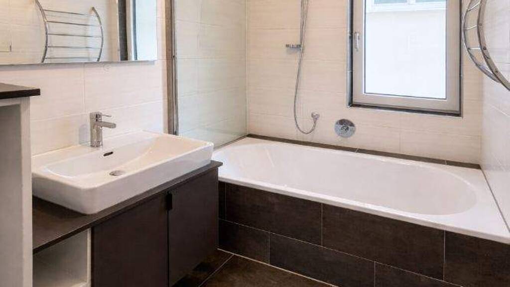 Das Badezimmer ist mit Fenster, Badewanne und Einzelwaschtisch ausgestattet. Das WC ist separat ausgeführt.