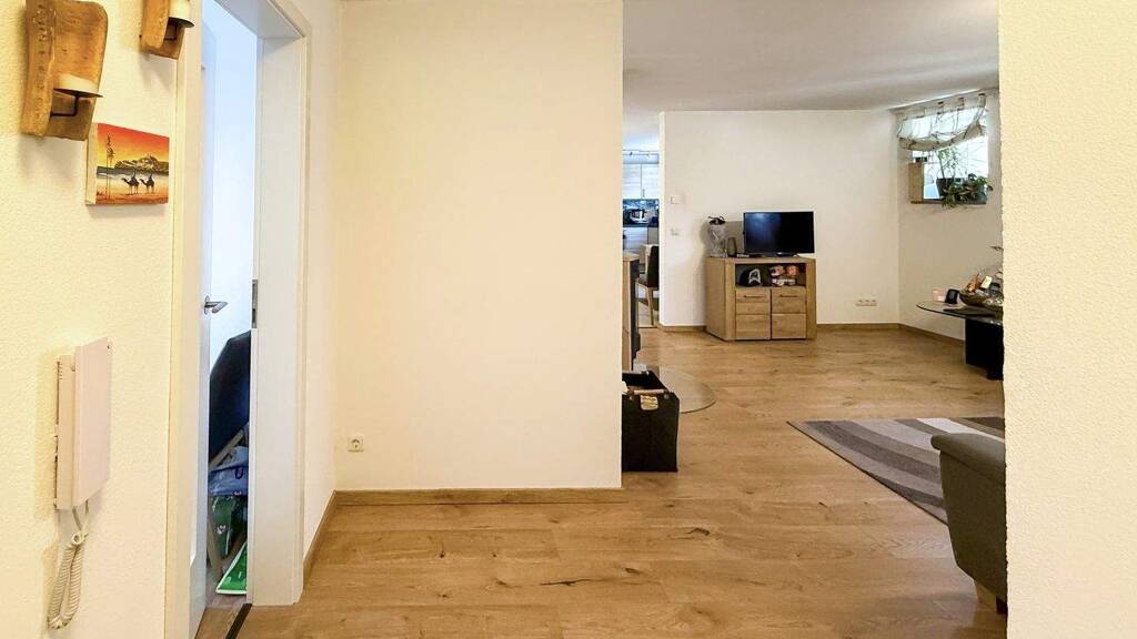 Die Wohnfläche von ca. 100 m² erstreckt sich über 3,5 Zimmer im 1. Obergeschoss. Zusätzlich stehen im Dachgeschoss rund 60 m² Nutzfläche zur Verfügung, die vielseitige Nutzungsmöglichkeiten bieten. Das 1. Obergeschoss überzeugt durch eine durchdachte Raumaufteilung und ein angenehmes Wohnambiente. Sämtliche Wohnräume sind mit einer Fußbodenheizung ausgestattet, während ein Schwedenofen im Wohnzimmer an kühleren Tagen für wohlige Wärme und eine besonders gemütliche Atmosphäre sorgt.