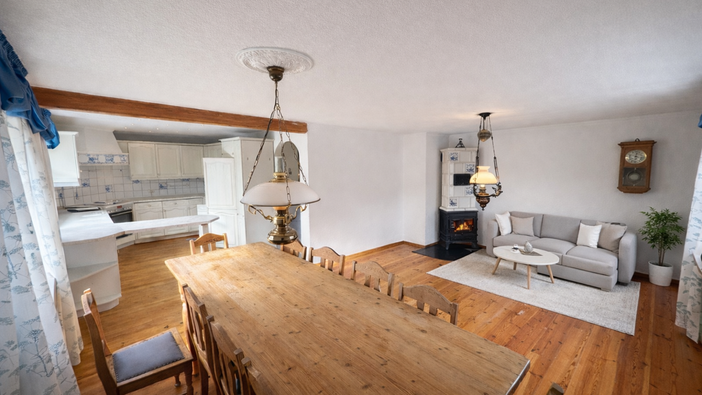 Wohnen mit Charakter: Herzstück des Hauses ist der offene Wohn- und Essbereich mit schönem Dielenboden und einem voll funktionsfähigen Kachelofen, der für behagliche Wärme und ein besonderes Wohnambiente sorgt. Die offene Einbauküche im Landhausstil fügt sich harmonisch in den Wohnbereich ein und ist mit sämtlichen Elektrogeräten ausgestattet - hier wird Kochen zum sozialen Mittelpunkt des Hauses.