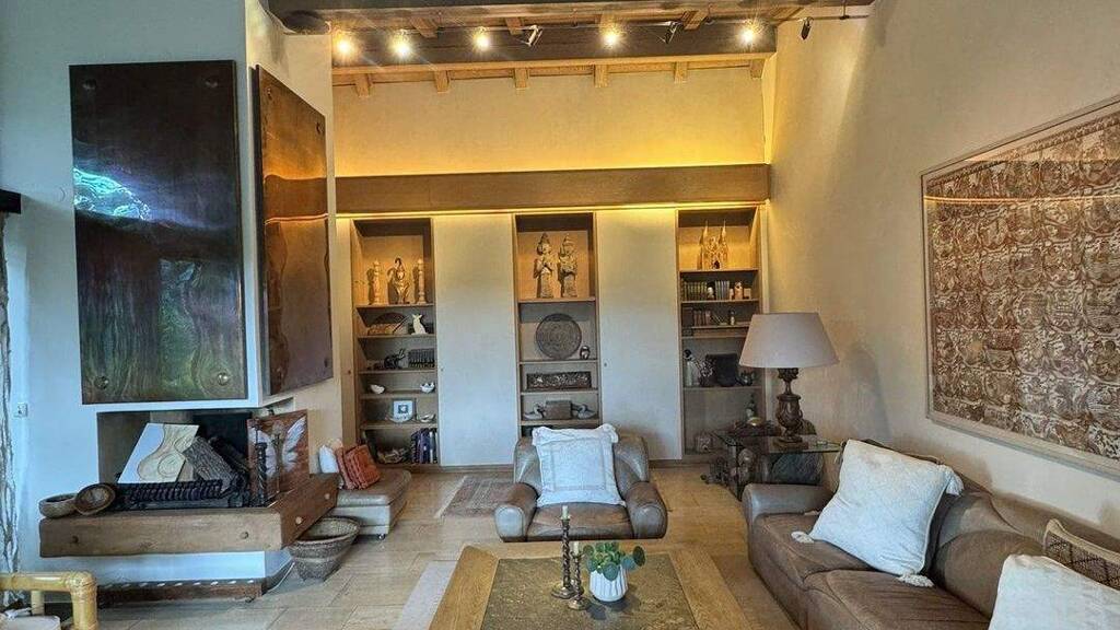 Das Wohnzimmer ist nach oben hin offen gestaltet, mit Blick auf die Balkendecke, was wiederum Großzügigkeit schafft. Hochwertige Ausstattung und edle Fußbodenbeläge aus Stein unterstreichen den gehobenen Anspruch des Hauses. Die offene Gestaltung sorgt für ein angenehmes Wohngefühl mit viel Tageslicht. Vor dem Wohnzimmer befindet sich der Essbereich und die Küche.