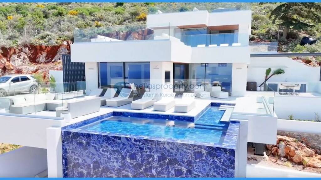 Entdecken Sie diese exquisite Villa mit 4 Schlafzimmern und 5 Badezimmern im charmanten Dorf Kokkino Chorio auf Kreta und genießen Sie einen atemberaubenden Meerblick, die Souda-Bucht und die majestätischen Weißen Berge. Inspiriert von den Luxushäusern von Bel Air kombiniert die 240 m2 große Villa klassische und zeitgenössische Designelemente mit hohen Decken, großen Fenstern und luxuriöser Ausstattung. Die Villa verfügt über einen großen Infinity-Pool, einen Wasserfall und einen Whirlpool im Freien und schafft so auf ihrem 4600 m2 großen Grundstück eine private Oase zur Entspannung und Unterhaltung.