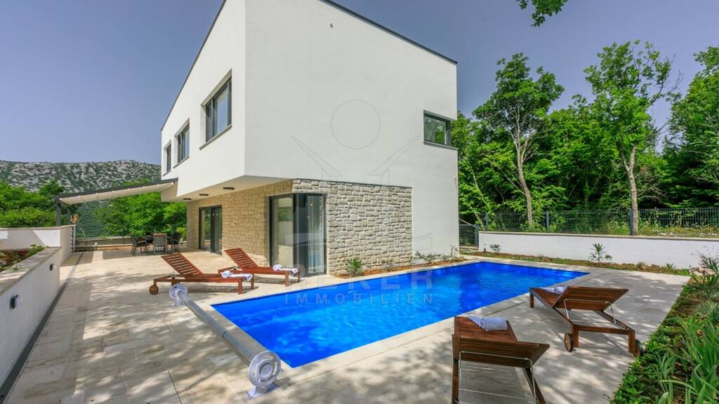 Kurzbeschreibung villa-grizane-pool-waldrand Objekt Hier hören Sie Vögel statt Verkehr. Diese stilvolle Villa verbindet modernes Design mit natürlicher Umgebung - mit Pool, Steingrill, Sonnendeck und viel Raum für Leben. Ihr Rückzugsort wartet.