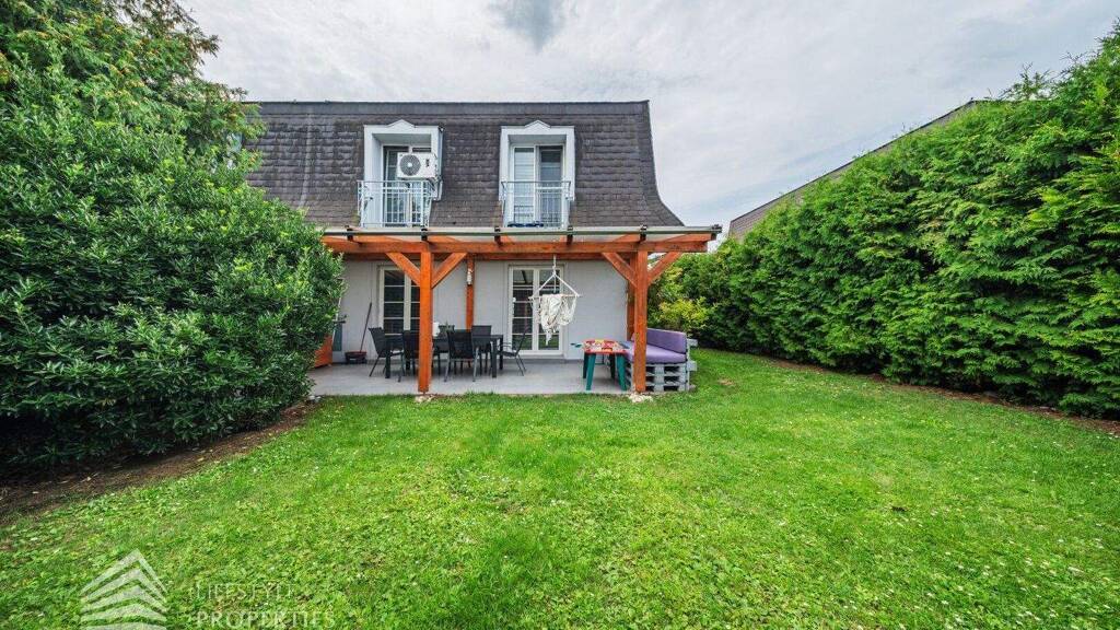Im Erdgeschoss befindet sich ein rund 42 m² großer Wohn- und Essbereich, der dank großzügiger Fensterflächen besonders hell und freundlich wirkt. Von hier gelangt man direkt auf die ca. 24 m² große, überdachte Terrasse sowie in den gepflegten Garten mit Grillplatz - ein idealer Ort zum Entspannen und für gesellige Abende. Eine vollständig ausgestattete Küche, ein Vorraum mit viel Stauraum sowie ein Gäste-WC vervollständigen diese Ebene.