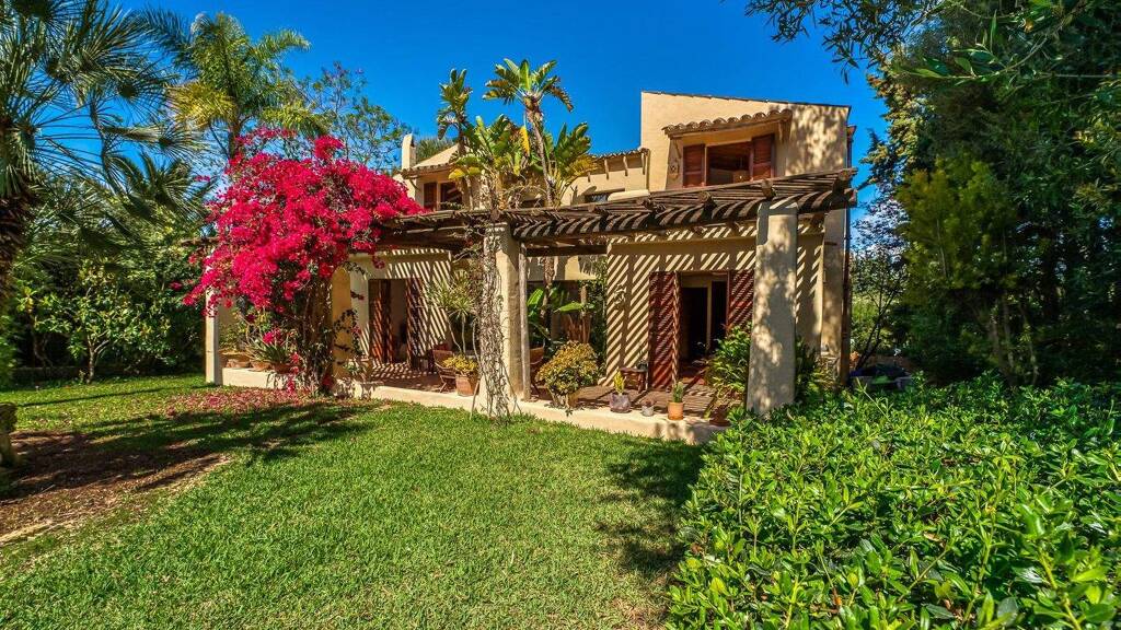 Das mediterrane Traumhaus im Kolonialstil erstreckt sich über zwei großzügige Etagen und bezaubert mit hochwertigen Details aus natürlichen Materialien: antike mallorquinische Finca-Holztüren, hohe Decken mit runden Holzbalken, handgearbeitete Terrakotta-Böden, Messingarmaturen und ein Kamin im mexikanischen Stil.