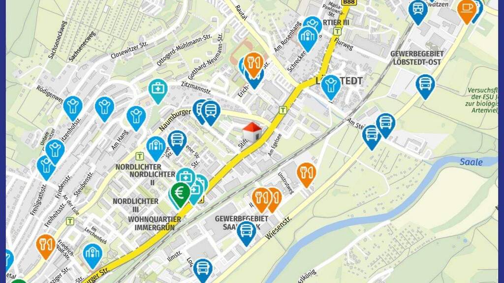 Diese exklusive Eigentumswohnung befindet sich in einem der begehrtesten Stadtteile von Jena, nur etwa 2 km vom pulsierenden Stadtzentrum entfernt. Die Lage in Jena Löbstedt bietet eine perfekte Kombination aus urbanem Lebensstil und ruhiger Wohnatmosphäre. In der unmittelbaren Umgebung finden sich zahlreiche Bildungseinrichtungen, darunter ein Kindergarten, eine Grundschule, eine Realschule und ein Gymnasium, die alle bequem innerhalb von 0,5 km zu erreichen sind. Die ausgezeichnete Anbindung an das Autobahnnetz, nur 7 km entfernt, erleichtert den Zugang zu den umliegenden Städten und Regionen. Diese Lage stellt einen idealen Ausgangspunkt für Familien und Berufspendler dar, die Wert auf eine hervorragende Infrastruktur und Nähe zu Bildungsangeboten legen.