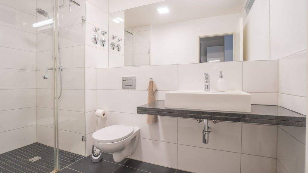 Die Einbauküche ist funktional und ansprechend gestaltet und fügt sich harmonisch in das Gesamtbild ein. Das innenliegende Badezimmer verfügt über eine Tageslichtanbindung und ist mit einer großen, ebenerdigen Dusche ausgestattet.