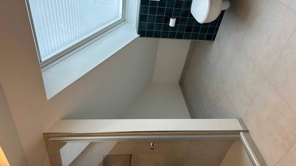 Das sehr helle Badezimmer ist mit einer Regendusche, einer Echtglasabtrennung, einem Handtuschheizkörper, einem WC sowie einem großen Waschtisch mit 80 cm und Designarmaturen ausgestattet.