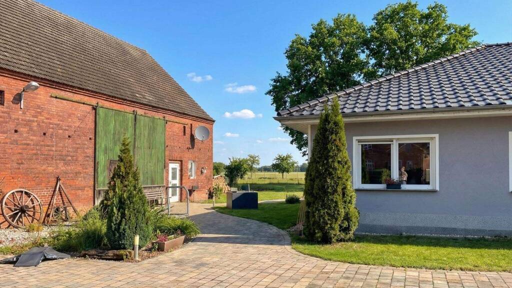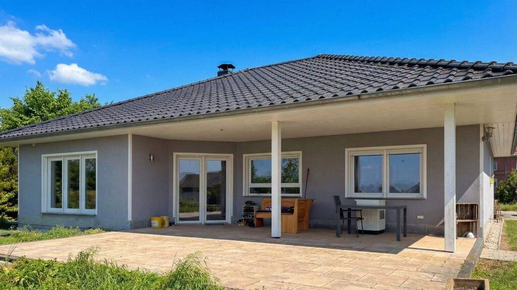 Dieser ca. 2013 erbaute, moderne Bungalow überzeugt durch hochwertige Ausstattung, klare Architektur und ein weitläufiges Grundstück mit beeindruckendem Blick in unbebaute Natur. Das Objekt ist bezugsfertig, top gepflegt und bietet ein einmaliges Wohngefühl für Familien, Paare oder alle, die Komfort und Ruhe suchen. Die Wohnfläche umfasst ca. 134 m² und verteilt sich komplett ebenerdig - ideal für jedes Lebensalter. Das Herzstück bildet der lichtdurchflutete Wohnbereich mit vielen Fenstern, offener Küche und Kamin. Mit insgesamt drei Schlafzimmern, einem geräumigen Badezimmer mit Wanne und Dusche sowie einem separaten Gäste-WC ist das Haus perfekt für Familien geeignet. Die Ausstattung mit Fußbodenheizung, dreifach verglasten Fenstern, Rollläden, einer modernen Erdwärmepumpe und einer überdachten Terrasse sorgt für höchsten Wohnkomfort und Energieeffizienz. Auf dem großzügigen Grundstück befindet sich eine große Scheune, ausgebaut mit Sommerküche, separatem WC und Werkstatt - ideal für Hobby, Feierlichkeiten oder Stauraum. Die große Einfahrt bietet zahlreiche PKW-Stellplätze, auch für größere Fahrzeuge.