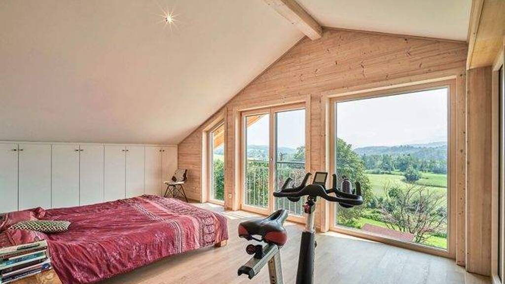 In traumhafter Lage von Murnau-Hechendorf, mit einem einmaligen Panoramablick in die Berge und über das Moos, liegt dieses erst im Jahre 2020 neu erbaute KfW70-Holzhaus.