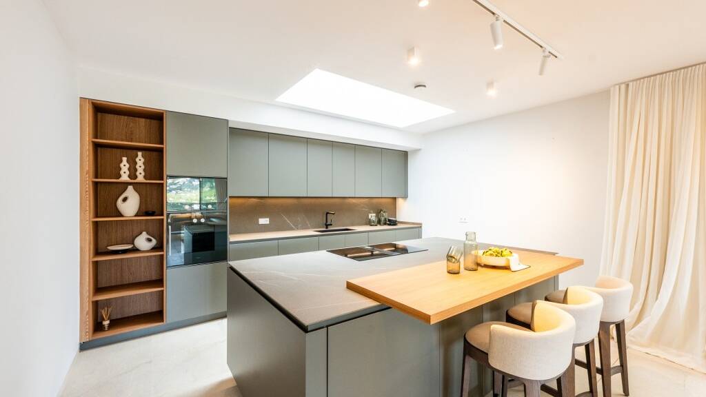 Die n?chste Ebene ist offen gestaltet und besteht aus einer modernen K?che mit Speisekammer, einem G?ste-WC und einem gro?en Wohn-/Esszimmer mit Kamin, das direkten Zugang zu einer Terrasse mit Pergola hat.