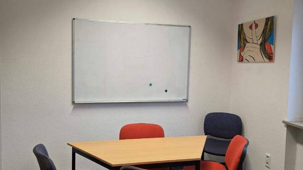 Die Arbeitsplätze befinden sich in drei Räumen; zwei davon sind kleinere Büroräume, der andere ist ein größerer Büroraum mit einer Verbindungstür.