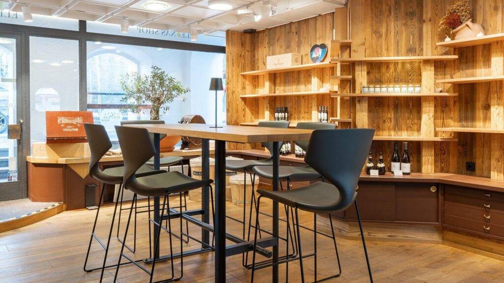 Eine stilvolle Bar, elegante Hochtische sowie ein durchdacht integrierter Kassenbereich bilden das Herzstück des Raumes. Jedes Detail der neuen Inneneinrichtung wurde sorgfältig ausgewählt und hochwertig umgesetzt.