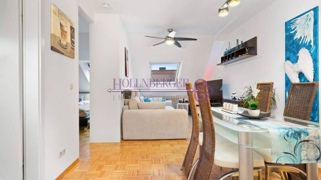 Der Wohnbereich ist offen gestaltet und bietet ausreichend Platz für Wohnen und Essen. Der Boden ist mit Parkett ausgestattet, was dem Raum eine warme und einladende Wirkung verleiht.