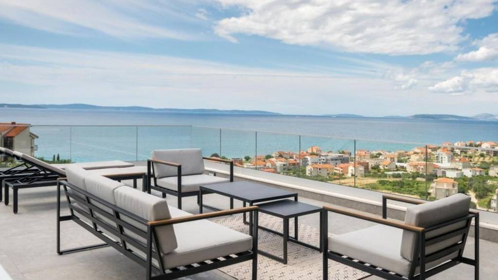 Zum Verkauf steht eine neue gebaut moderne Villa in der Nähe von Split. Es liegt auf dem Hügel nur 350 Meter von Küste und es gibt schöne panoramische Blick am Meer, Inseln und Sonnenuntergang. Das Gebäude war im 2019 unter Verwendung hochwichtigen Materialen und Ausstattung gebaut. Auch das Innerraum ist mit Stil eingerichtet und angestettet. Villa hat drei Etage verbunden durch Innertreppe. Auf Villen Erdgeschoss ist Wohnzimmer mit offenes Konzept Küche und Esszimmer, Schlafzimmer mit Bad en Suite und Toilette für Gäste. Erste Stock hat drei Schlafzimmern mit Baden en Suite. Alle Schlafzimmern haben fantastische Meerblick. Das Untergeschoss der Villa besteht aus extra Wohnzimmer mit Küche, Sauna, Fitness Studio, Badezimmer, Billardraum, Wäschekammer und Garage. Der gepflegte Garten bietet ein besonderes Erlebnis, weil es hat ein Schwimbad mit Gegenstromanlage. Es ist idealische Lage für Kindern zu spielen, weil es hat ein Spielplatz und auch eine Außenküche mit Essbereich und Grill geben Erwashsene eine Chance zu genissen. Villa hat mehrere Parkplätze. Infrastruktur: asphaltierte Zufahrtsstraße, Strom, Wasser, Klärgrube