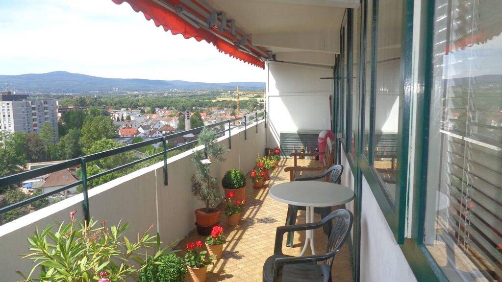 Das großzügige, lichtdurchflutete Wohnzimmer bietet direkten Zugang zum weitläufigen Balkon, der auch vom Schlafzimmer aus begehbar ist. Von hier genießen Sie einen beeindruckenden Panoramablick über den Taunus. Elektrische Rollläden im Wohnzimmer sowie eine Markise auf dem Balkon sorgen für zusätzlichen Komfort.