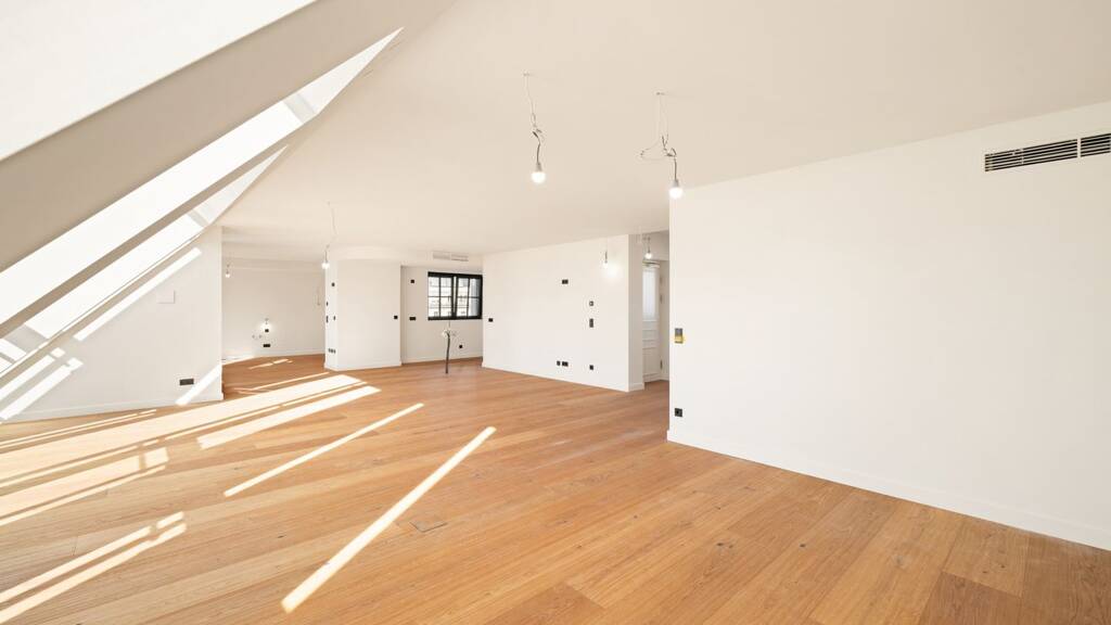 Der Lift führt direkt in den privaten Vorraum des Penthouses, von dem aus man in die beeindruckende Wohnküche mit über 71 m² gelangt. Zu beiden Seiten dieses exklusiven Dachgeschosses öffnen sich zwei Terrassen mit je rund 35 m², die sowohl vom Wohnbereich als auch von den zwei Schlafzimmern zugänglich sind.