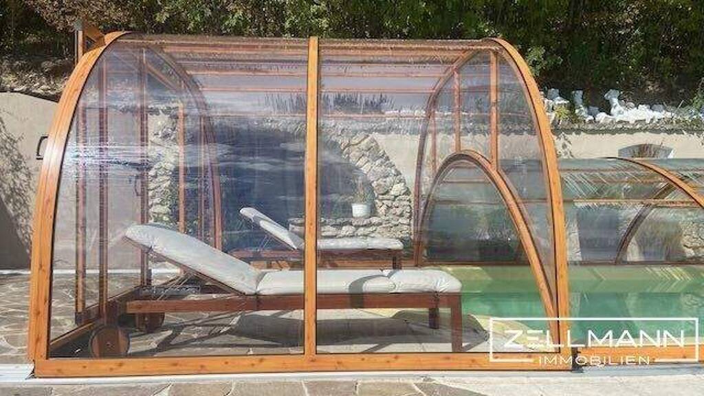 Der Garten mit Poolanlage ist bewusst als Ruhe- und Erholungszone gestaltet und fügt sich harmonisch in die natürliche Topografie ein. Die Kombination aus mediterranen Elementen, Naturstein und üppiger Bepflanzung schafft ein Ambiente von zeitloser Eleganz.