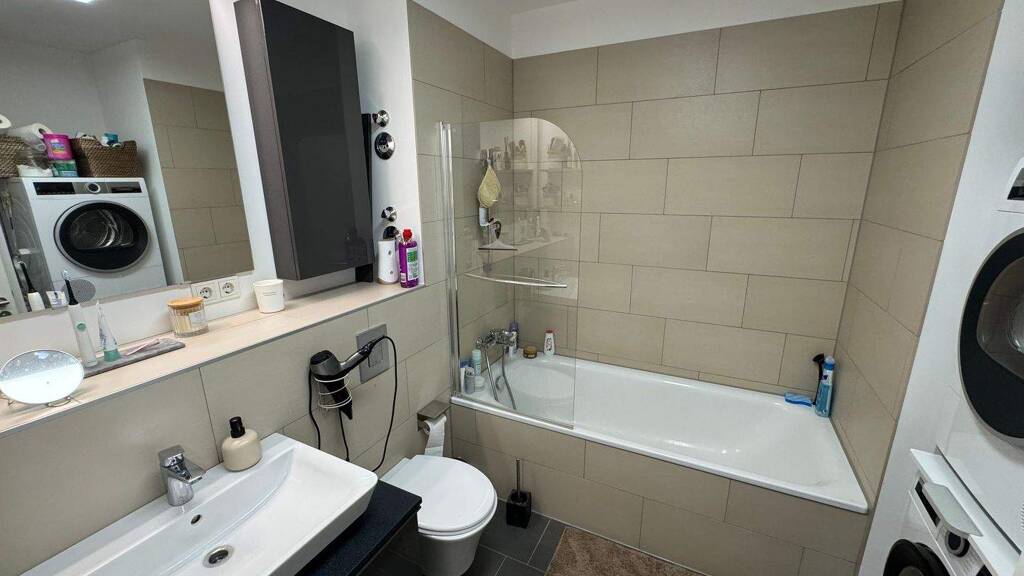 Das moderne Duschbad begeistert mit großformatigen Wand- und Bodenfliesen in warmen Naturtönen. Eine bodengleiche Dusche, hochwertige Sanitärobjekte sowie ein großzügiger Waschtischbereich bieten zeitgemäßen Komfort. Zudem steht ausreichend Platz für die Integration einer Waschmaschine zur Verfügung.