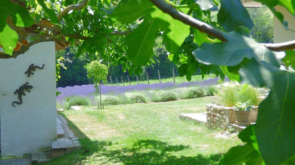 Die Hauptwohnung (ca. 130 m2) umfasst 4 Zimmer, eine Wohnküche, zwei Badezimmer und einen Wirtschaftsraum. Die zweite Wohneinheit (ca. 60 m2) ist ein loftartiger, offener Raum mit Schlafzimmerbereich, Bad mit Badewanne und separatem Entrée. Die überdachte Terrasse bietet einen traumhaften Ausblick auf das eigene Lavendelfeld.