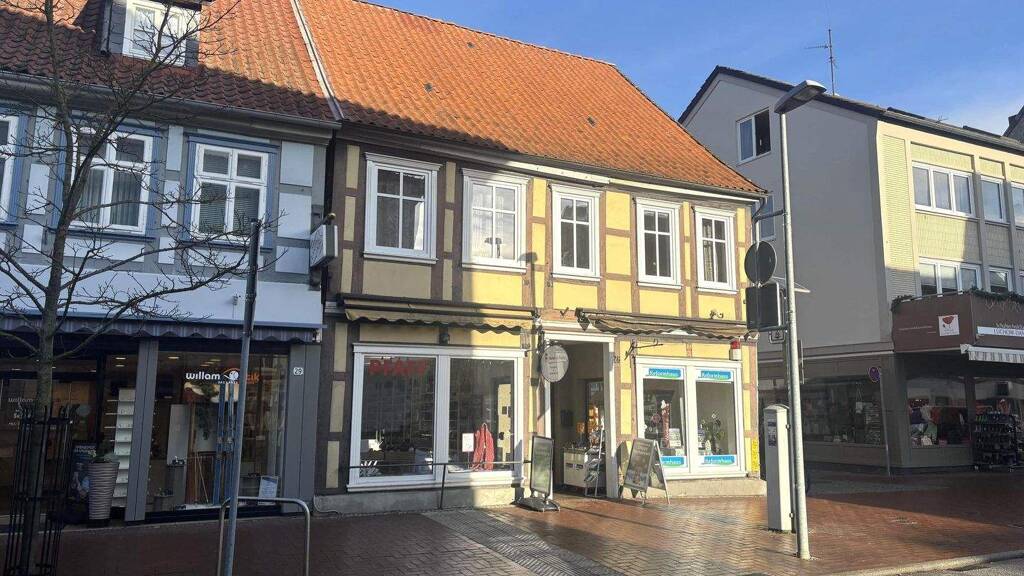 Im Zentrum der Kreisstadt gelegenes Wohn- und Geschäftshaus mit zwei Ladengeschäften im Erdgeschoss und zwei Wohnungen im Obergeschoss. Die Gewerbeeinheit rechts besteht aus einem ca. 47 m² großen Ladengeschäft, Lager und WC. Die Gewebeeinheit links hat eine Größe von ca. 96 m² und besteht aus einem großen Ladengeschäft, Büro mit Teeküche und WC. Beide Gewerbeeinheiten sind vermietet. Die kleine Wohnung im Obergeschoss hat ca. 50 m² Wohnfläche und teilt sich auf in zwei Zimmer, offene Küche, Flur und einem Duschbad, diese Wohnung ist vermietet. Die zweite Wohnung hat eine Größe von ca. 90 m² Wohnfläche und ist im Moment nicht vermietet, könnte also von einem möglichen Erwerber selbst genutzt werden. Diese freie Wohnung teilt sich auf in vier Wohnräume (ein Zimmer als Durchgangszimmer), Flur, Küche, Duschbad und Hauswirtschaftsraum. Die Fenster sind aus Holz und Kunststoff, isolierverglast und teilweise mit aufliegenden Sprossen versehen. Geheizt wird mit einer Gaszentralheizung aus dem Jahr 1983 (Niedertemperaturkessel für den keine Austauschpflicht besteht). Das Dach ist überwiegend mit einer Betonpfanne eingedeckt, ein kleiner Dachteil - über dem großen Laden - wurde als Flachdach mit Schweiß- und Bitumenbahnen erstellt und für die Belichtung mit Lichtkuppeln versehen.