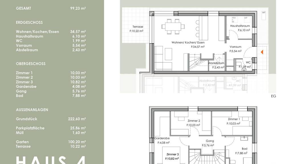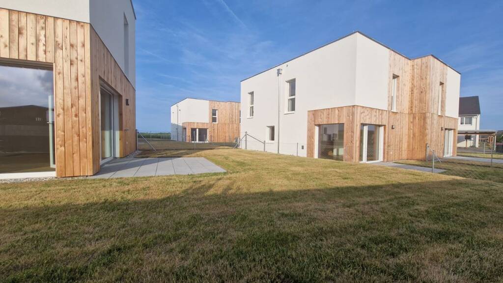 Im Erdgeschoß befinden sich Wohnen/Kochen/Essen mit direktem Zugang zur Terrasse und Garten sowie Windfang/Garderobe, Gäste-WC, Abstell- und Technikraum. Die Treppe führt in das Obergeschoss wo sich zwei Kinderzimmer, Elternschlafzimmer mit angeschlossenem Schrankraum und Badezimmer/WC erschließen.